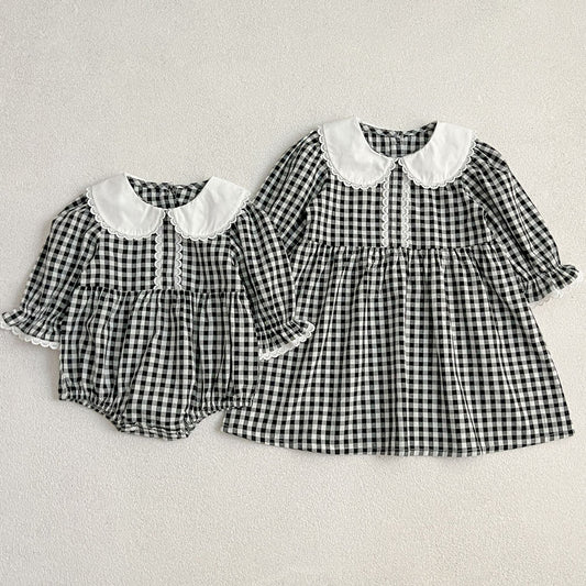 Body y vestido de manga larga con estampado de cuadrícula y cuello de encaje para hermanas pequeñas: conjunto a juego para hermanas princesas