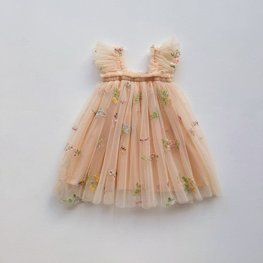 Vestido de verano con tirantes y diseño de malla bordada con flores sin mangas para niñas y bebés