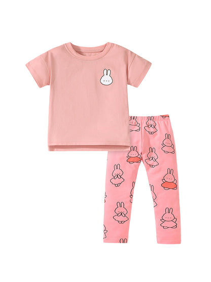 Conjunto de camiseta y pantalón rosa con dibujos de conejos de colores para niñas
