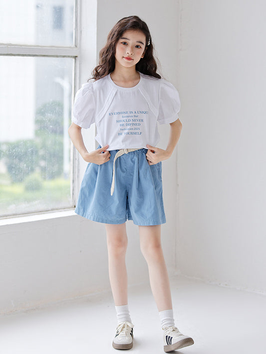 Conjunto de ropa de verano con estampado de letras para niñas, camiseta de manga corta y pantalones cortos plisados de color liso, superventas