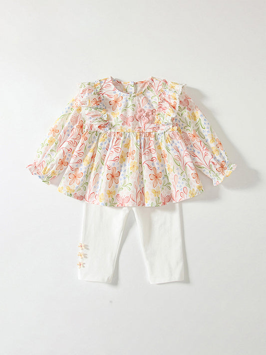 Conjunto de vestido y pantalón con diseño floral de manga larga para niñas recién nacidas de primavera – Conjunto de ropa