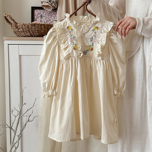 Vestido de otoño con cuello con volantes y mangas largas con bordado de flores para niñas