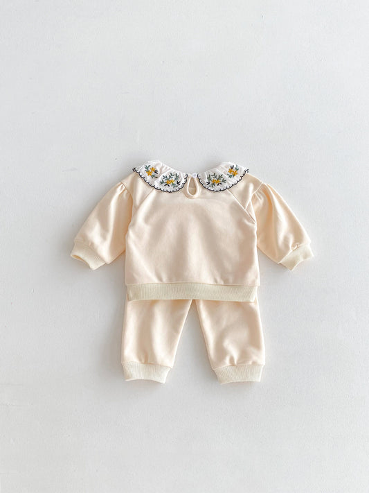 Lindo y versátil conjunto de dos piezas: blusa con cuello bordado con flores y pantalones de color liso para niñas y niños pequeños