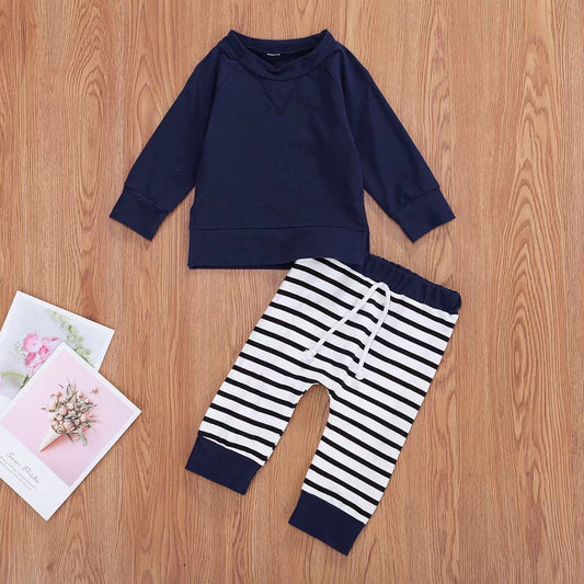 Baby Boy 1pcs Color sólido Sudadera con capucha Combo Patrón de rayas Conjuntos de pantalones