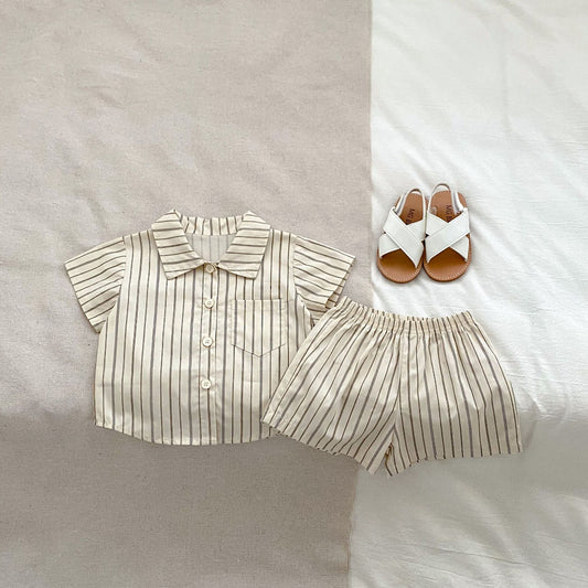 Conjunto de ropa de verano para bebés y niños con camisa y pantalones cortos con cuello vuelto y estampado de cuadros/rayas