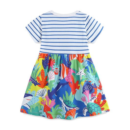 Summer Pure Cotton Animals Cartoon Pattern Short Sleeves Dress for Stylish Girls