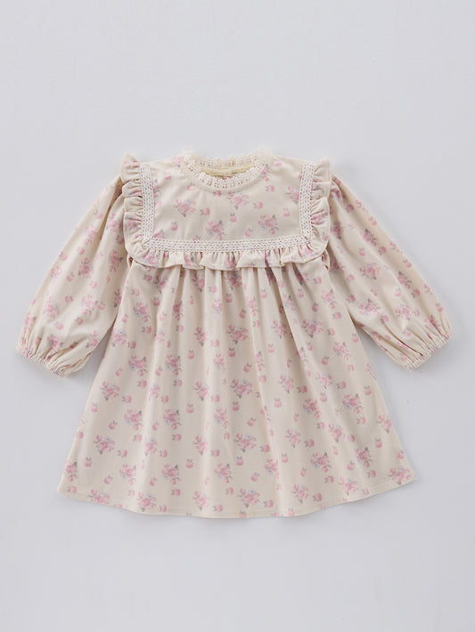 Spring and Autumn Floral Printed Long-sleeved Dress with Lace Neck for Stylish Girls