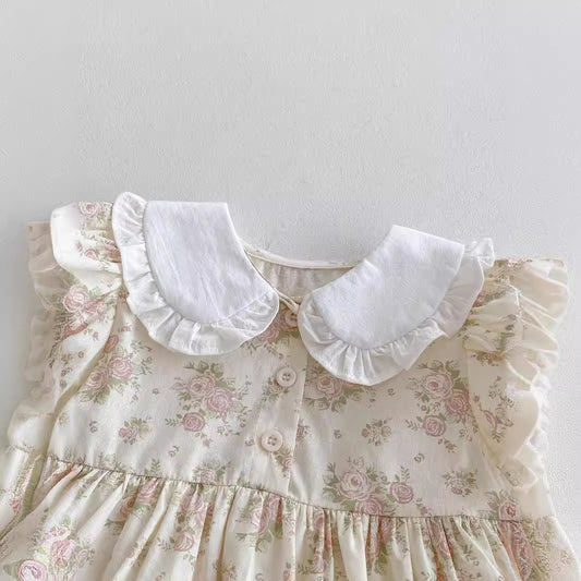 Recién llegado de verano, mono con cuello Peter Pan y estampado de flores de manga corta para niñas pequeñas