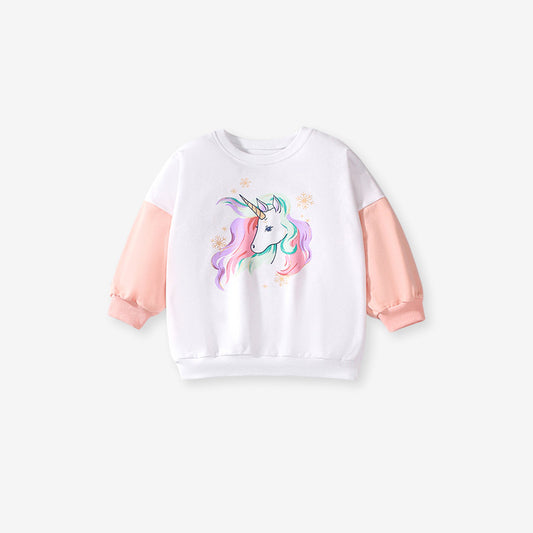Conjunto de sudadera y pantalones con cuello redondo y mangas largas con estampado de unicornio de dibujos animados para niñas de primavera y otoño