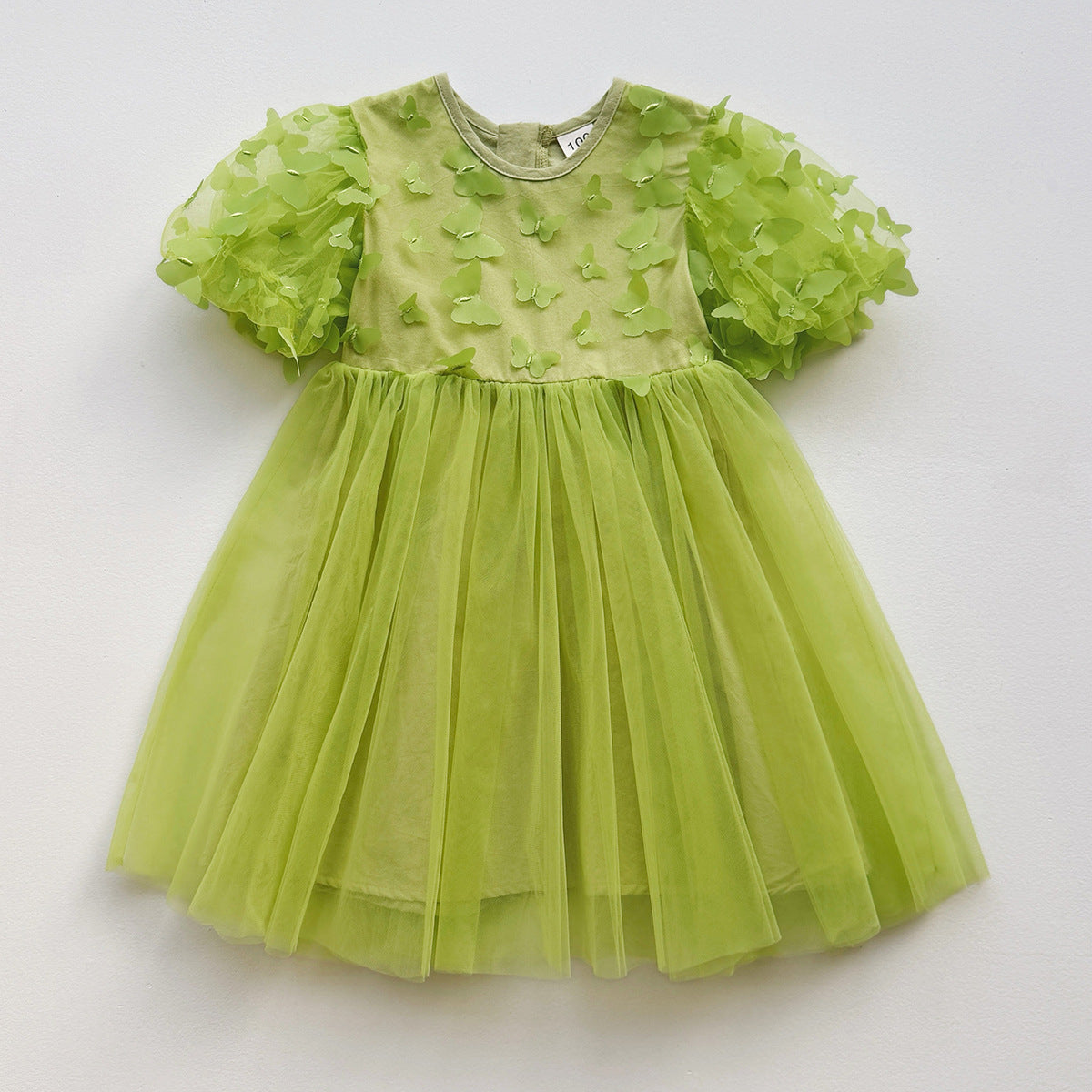 Vestido de tul de manga corta con estampado de mariposas para niñas con estilo en verano.