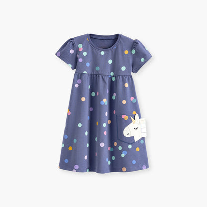 Vestido de lunares de manga corta para niñas de primavera y verano con bolsillo de unicornio