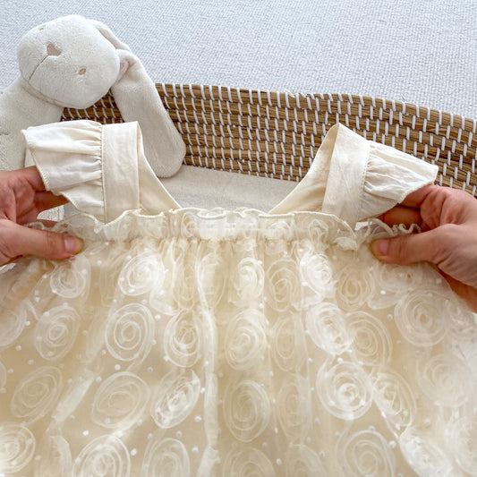 Summer Baby Girls Solid Color Rose Embroidery Lace Mesh Sleeveless Princess Onesie Dress