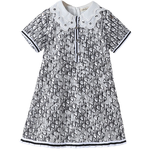 Design Summer Kids Girls Abstract Letters Print Fashion Short Sleeves Hollow Out Collar Dress
