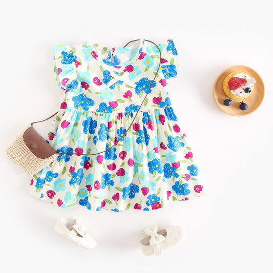 Summer Arrival Baby Girls Casual Floral Print Fly Sleeves Crew Neck Dress