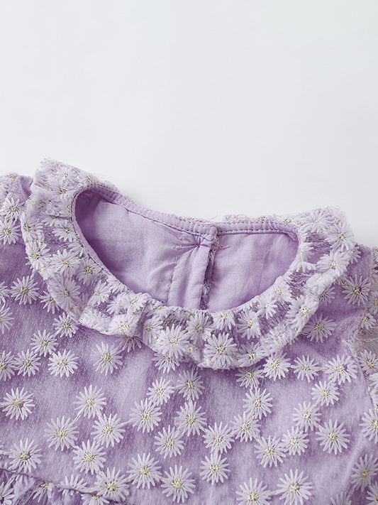 Summer Arrival Girls’ Daisy Flowers Pattern Embroidery Round Collar Fly Sleeves Dress