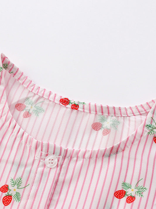 Summer Arrival Girls’ Strawberry Pattern Striped Single Breasted Short Sleeves Round Neck Dress