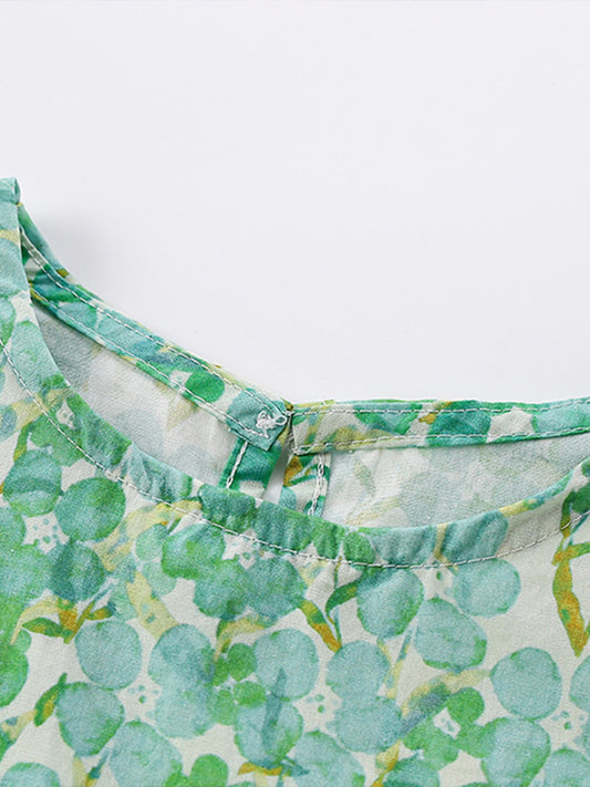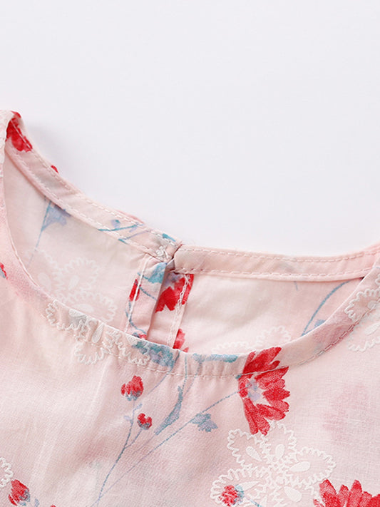 Summer Design Girls’ Flowers Pattern Fly Sleeves Single Breasted Crew Neck Dress