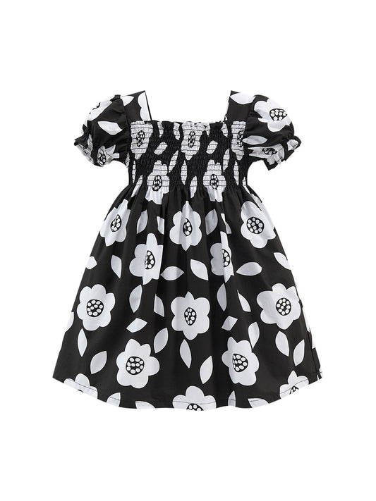 Baby Girls Square Neck Short Sleeves Black Floral Dress