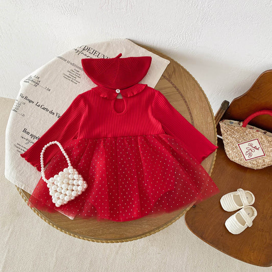 Spring Design Baby Red Long Sleeves Mesh Onesie Dress For Girls