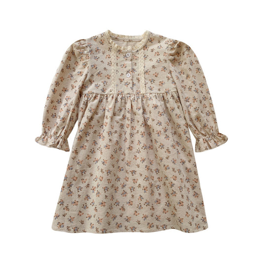 Arrival Autumn Girls Vintage Flowers Pattern Long Sleeves Lace Trim Crew Neck Dress