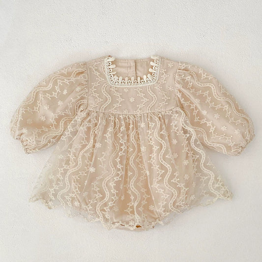 Autumn Baby Girls Flowers and Geometric Embroidered Pattern Long-sleeved Tulle Onesies and Dress – Princess Sister Matching Set