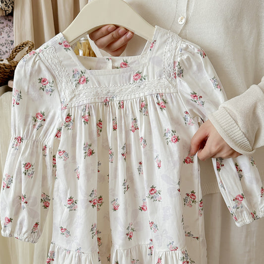 Design Autumn Girls Fashion Floral Long Sleeves Square Neck Dress