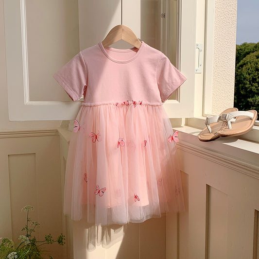 Summer Baby Kids Girls Princess Crew Neck Short Sleeves 3D Butterfly Mesh Patchwork Dress