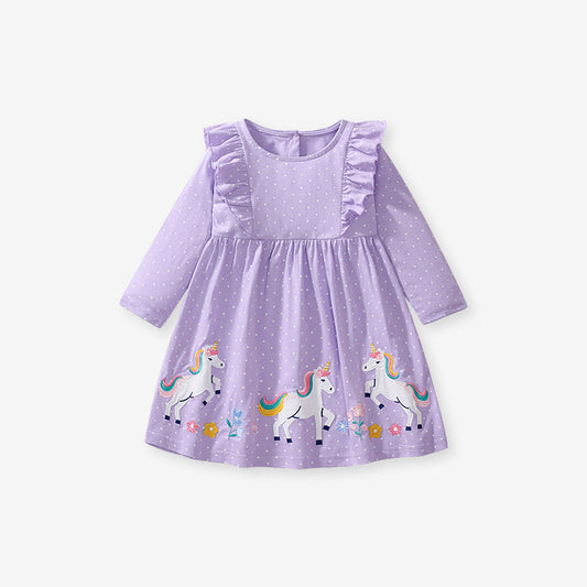 Design Autumn Girls Unicorn Cartoon And Dots Pattern Crew Neck Long Sleeves Princess Dress