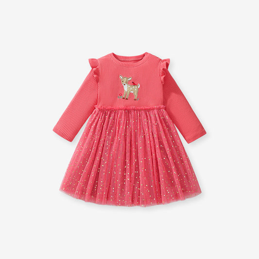 Design Autumn Girls Cartoon Deer Pattern Crew Neck Long Sleeves Tulle Patchwork Dress