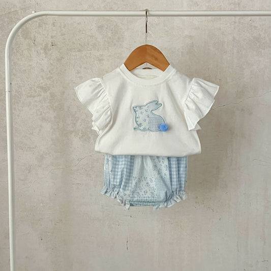 Summer Arrival Baby Kids Girls Boutique Versatile Rabbit Pattern Fly Sleeves Top And Floral And Plaid Shorts, Clothing Set