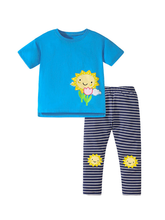 Summer Baby Kids Girls Sunflower Print Short Sleeves T-Shirt And Striped Pants Clothing Set