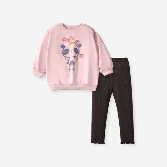 Spring And Autumn Girls Cartoon Panda And Flowers Long Sleeves Top Sweatshirt And Pants Clothing Set
