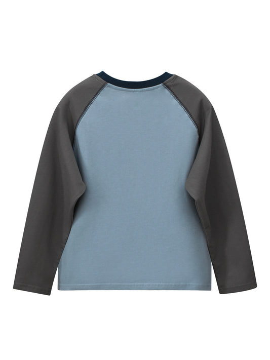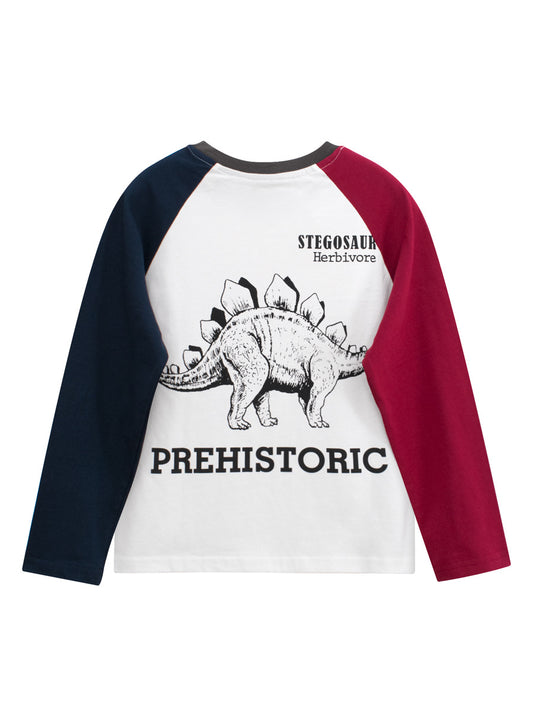Spring Arrival Kids Dinosaur Logo Crew Neck Long Sleeves Color Patchwork Top