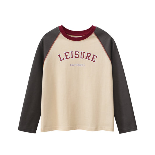 Spring Arrival Kids Letters Pattern Crew Neck Long Sleeves Color Patchwork Top