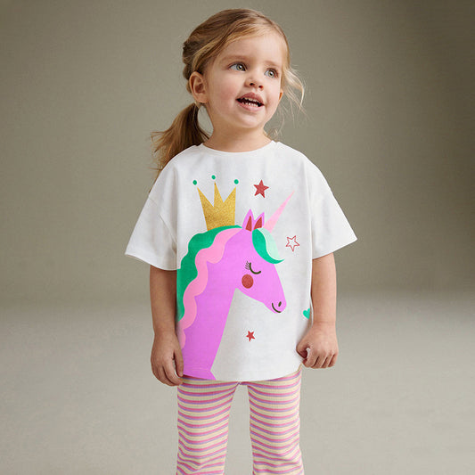Summer Baby Kids Cartoon Unicorn Pattern T-shirt and Striped Pants Clothing Set for Girls