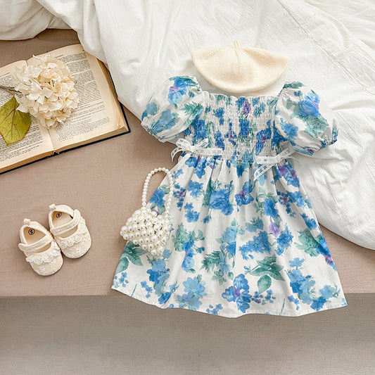 Summer Girls Blue Floral Pattern Square Neck Pleated Onesies And Girls’ Dress – Princess Sister Matching Set