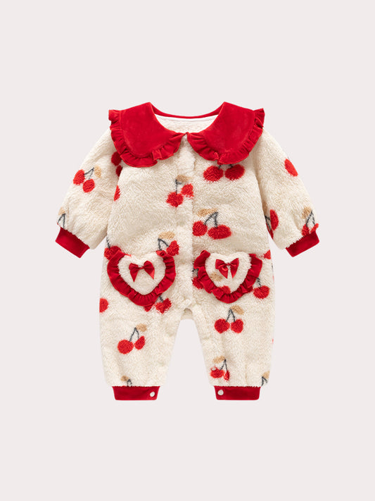 Autumn and Winter Arrival Baby Girls Cherry Pattern Polar Fleece Rompers