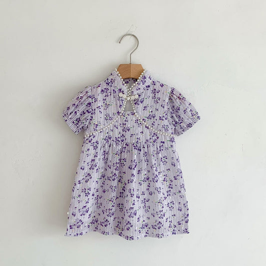 Arrival Summer Girls Dense Floral Pattern Short Sleeves Beaded Design Dress