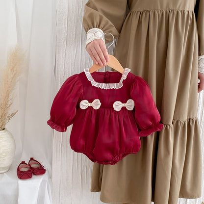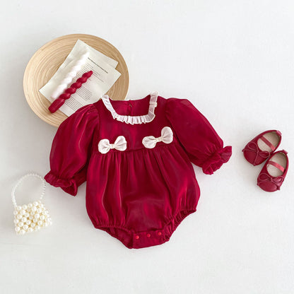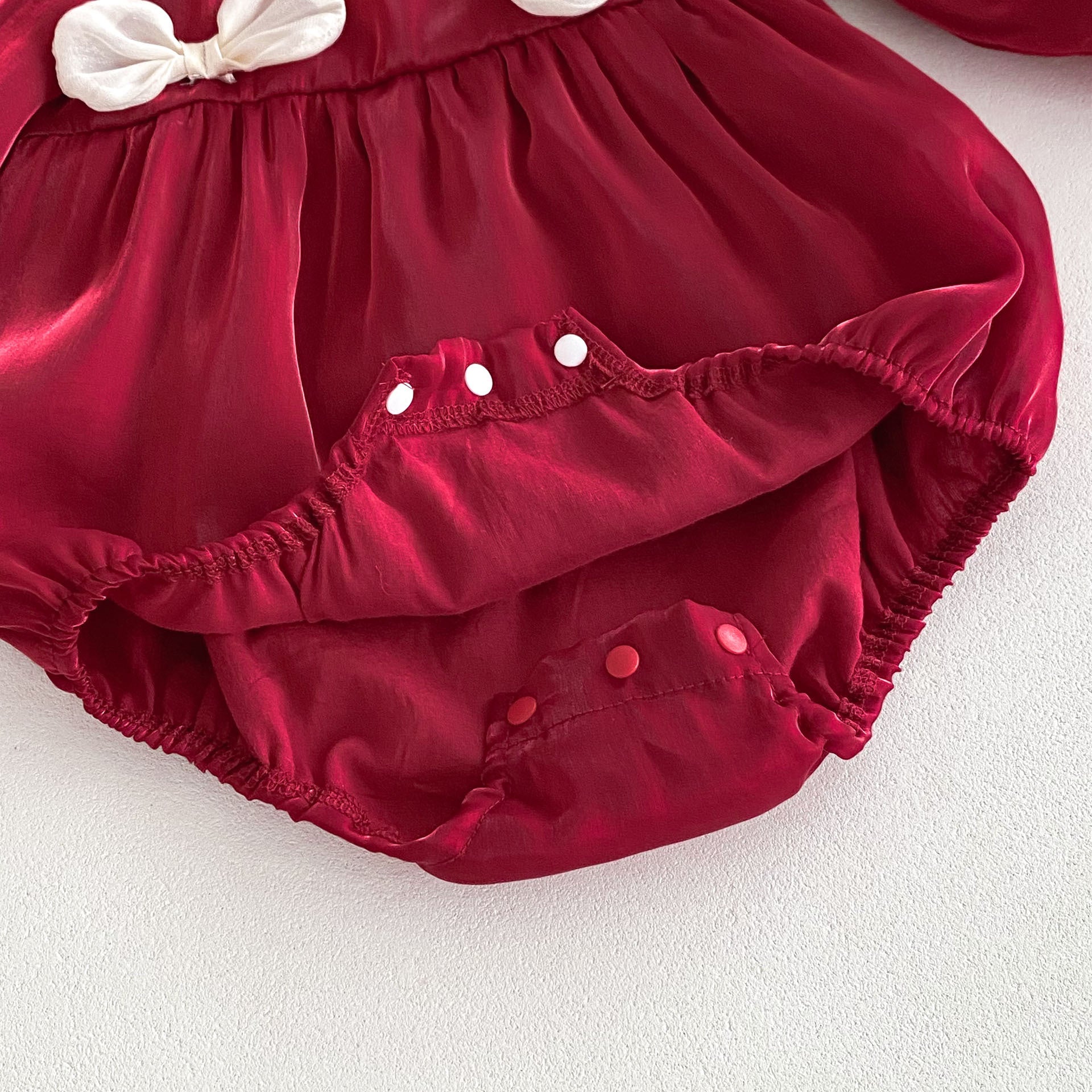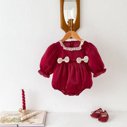 Autumn Arrival Baby Girls Long Sleeves Square Ruffle Neck Double Butterfly-bows Attached Red bodysuit