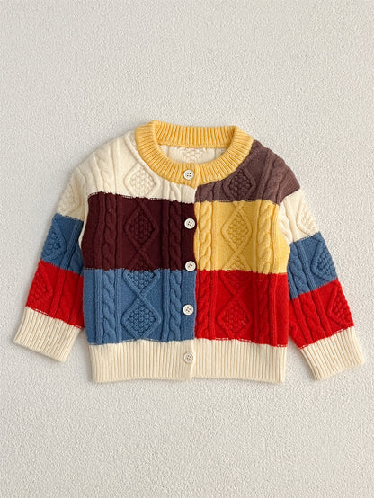 Autumn Design Baby Kids Unisex Color Patchwork Crew Neck Knitted Cardigan Knitwear
