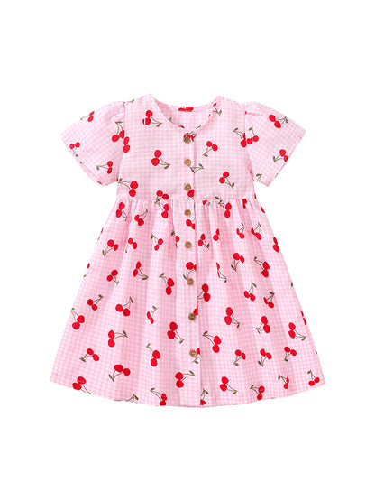 Baby Girls Crew Neck Plaid Cherry Print Short Sleeves Dress