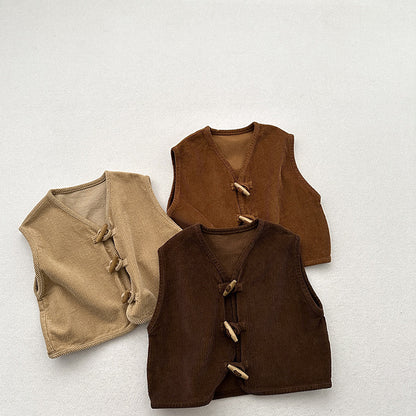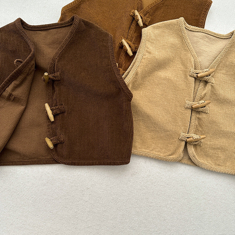 Children’s Waistcoat Japanese Corduroy Tone Sleeveless Vest Spring And Autumn Style Retro Wooden Button Corduroy Vest For Boys And Girls