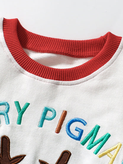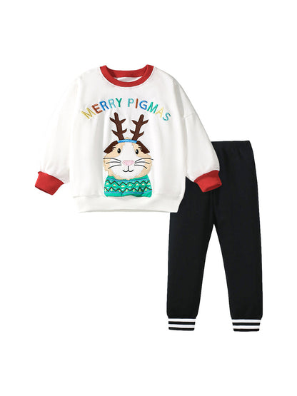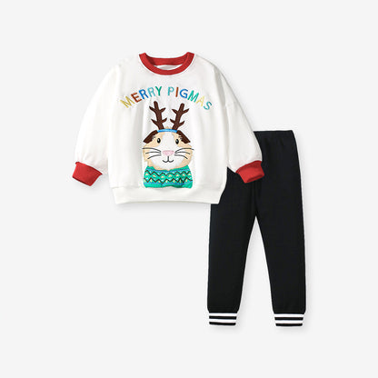 Spring and Autumn Girls Cartoon Christmas Pattern Long Sleeves Crew Neck Top Color Patchwork Sweatshirt and Pants Clothing Set