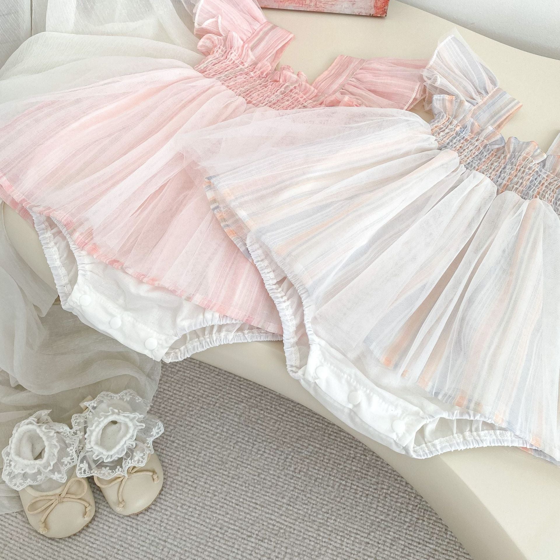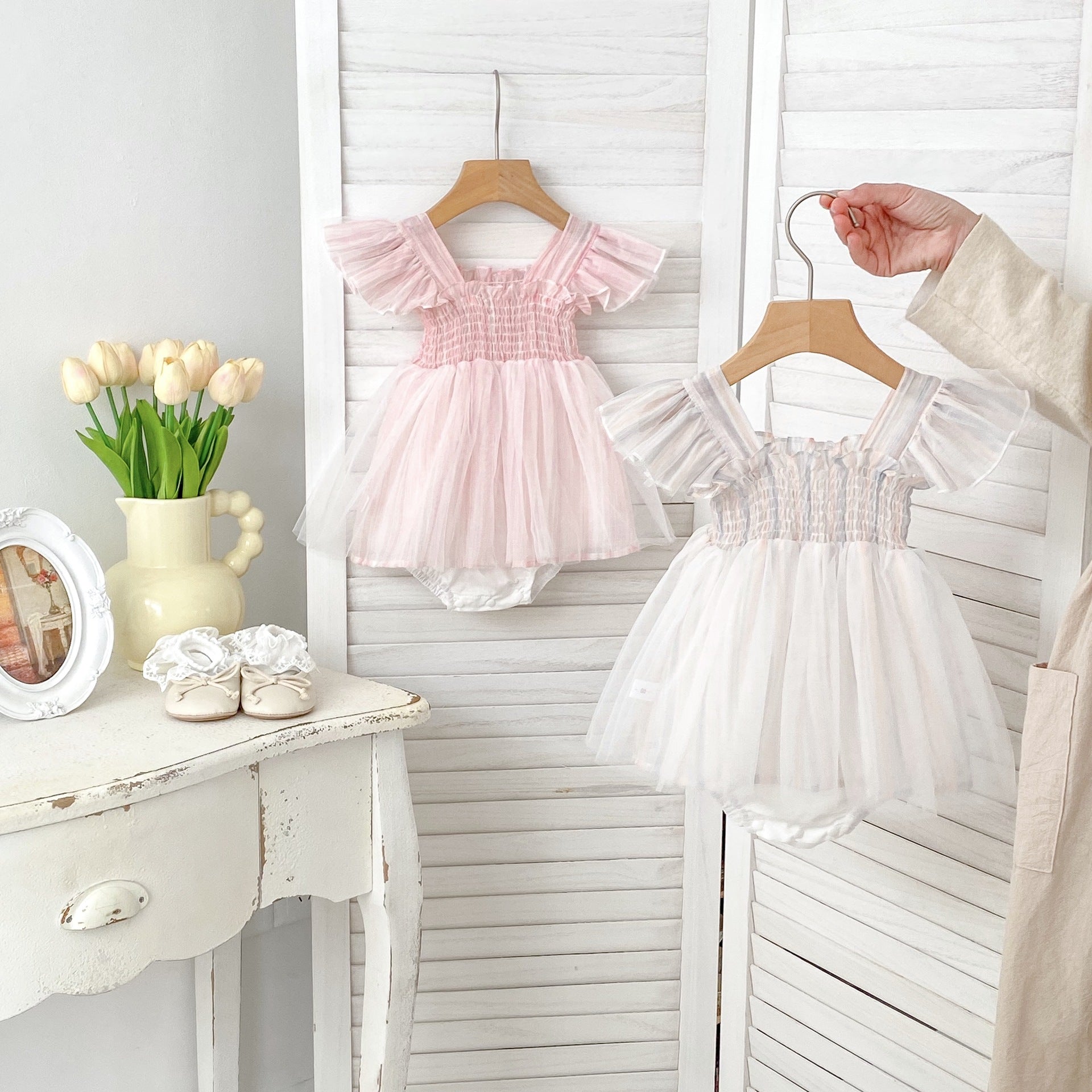 This delicate bodysuit features pleated fly sleeves and a square neckline, crafted with soft tulle patchwork for an elegant summer look. Designed for baby girls, it combines comfort and refined style, perfect for warm days and special occasions.