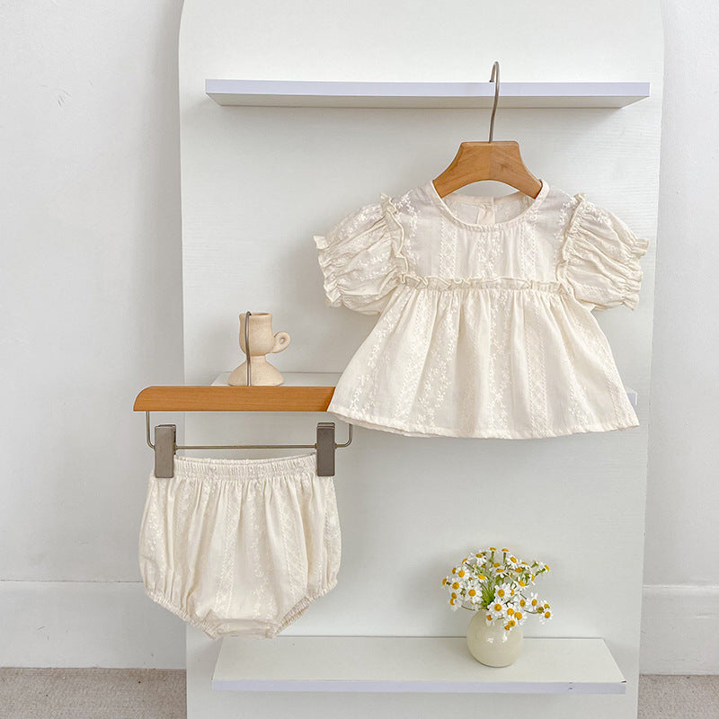 This elegant summer set features a charming combination of floral and plaid patterns, designed for baby girls. The short-sleeved top pairs effortlessly with matching shorts, offering both comfort and style for warm days. Crafted to keep your little one cool and fashionable, this ensemble is perfect for casual outings or special occasions.