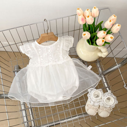 This delicate white bodysuit dress features intricate flower embroidery and fluttery fly sleeves, designed for your baby girl's summer wardrobe. The soft, breathable fabric ensures comfort during warm days, while the elegant crew neck adds a refined touch. Perfect for special occasions or everyday wear, this dress combines timeless style with gentle ease.