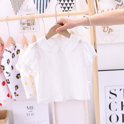 Summer Arrival Girls Peter Pan Collar Short Sleeves Solid Color Floral Pattern Embroidery Top Shirt