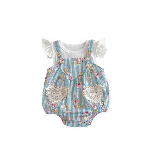 Summer Hot Selling Baby Girls Sleeveless Floral Pattern Strap Onesies And Solid Color Striped Shirt Clothing Set