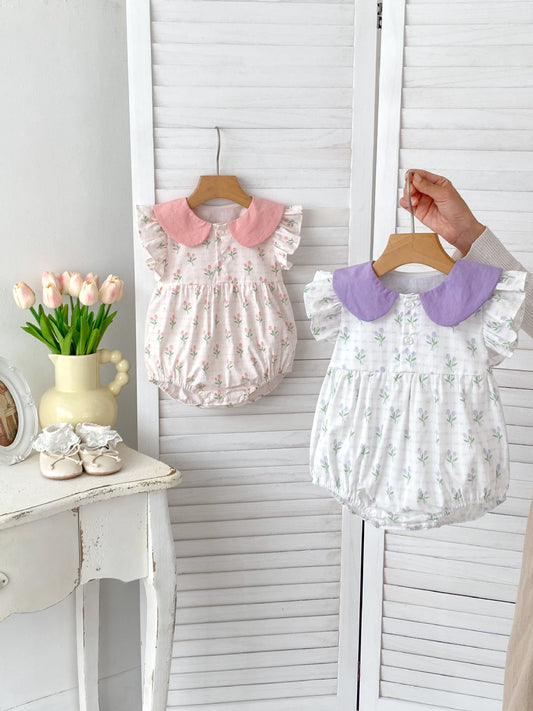 Summer Girls Floral Print Peter Pan Collar Fly Sleeves Onesies