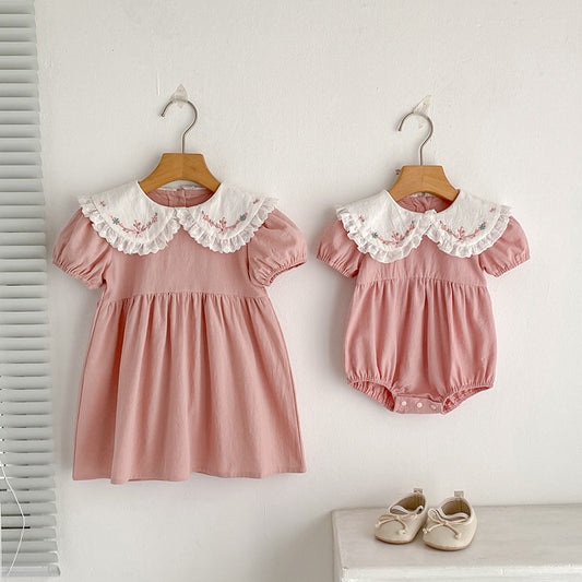 Summer Girls Simple Floral Embroidery Lace Trim Collar Short Sleeves Onesies and Girls’ Dress – Princess Sister Matching